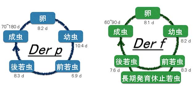 チリダニは、卵から孵化した後、幼虫→前若虫→後若虫→成虫の順で成長していきます。 ヤケヒョウヒダニ(Der p)とコナヒョウヒダニ(Der f)では、それぞれのライフステージの日数が異なります。