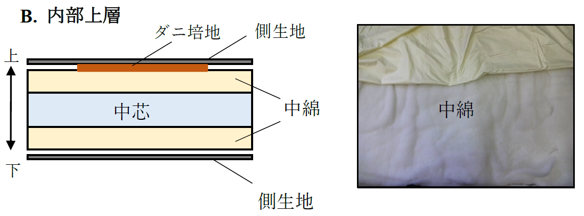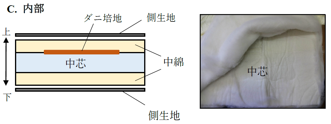 ⑵ 布団の表面(A:側生地の上)と内部上層(B:側生地と中綿の間)と内部(C:中綿と中芯の間)に、ダニ培地(生きたダニ5,000匹※1)を播種