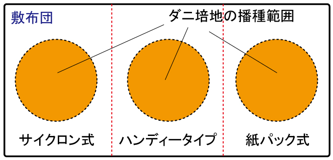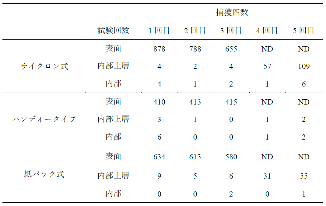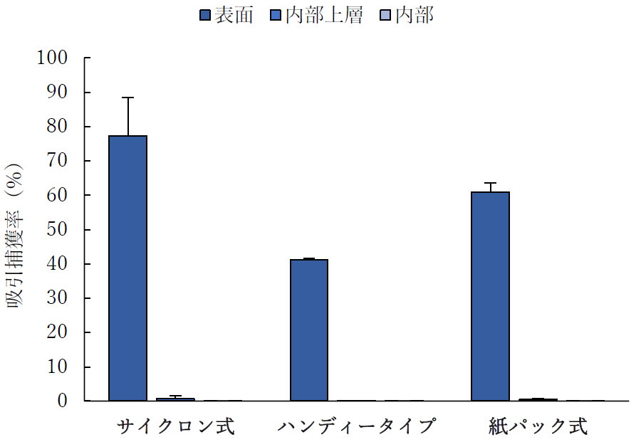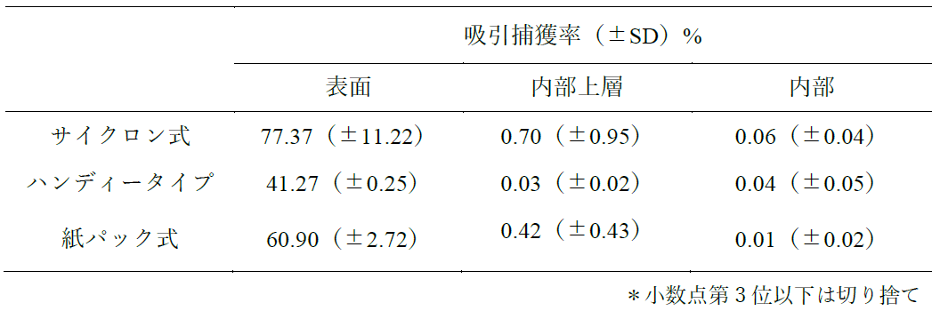 「サイクロン式掃除機」、「ハンディータイプ掃除機」及び「紙パック式掃除機」を用いて、敷布団表⾯・内部上層・内部に播種した生きているダニの吸引効果検証を行った。 その結果、表面の場合は、サイクロン式は77.3 %、ハンディータイプは41.2 %、紙パック式は60.9 %の吸引捕獲率を示し、生きているダニに対する⼀定の捕獲効果が観察された。 しかしながら、内部上層・内部については、いずれの掃除機においても吸引捕獲率は1 %以下であり、生きているダニの捕獲効果は著しく低かった。 このことから、掃除機の形式に関わらず、敷布団内部から生きているダニを吸引することは非常に困難であることが示唆され、実環境においても、 敷布団内部に生息しているダニを掃除機によって吸引捕獲することは期待できないと推察される。