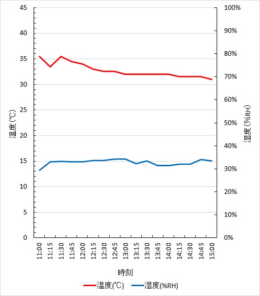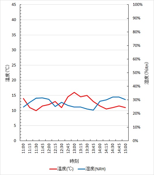 表面の平均温度は12 ℃(最高: 16 ℃、最低: 10 ℃)、平均湿度は28 %RH(最高: 32 %RH、最低: 23 %RH)であった。