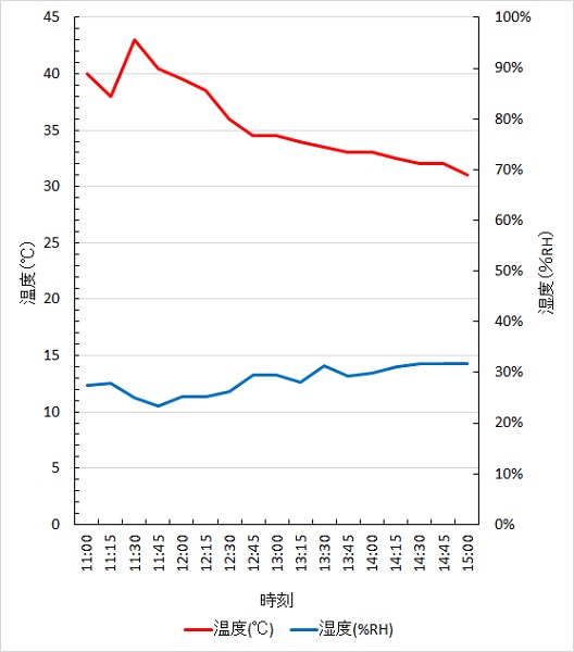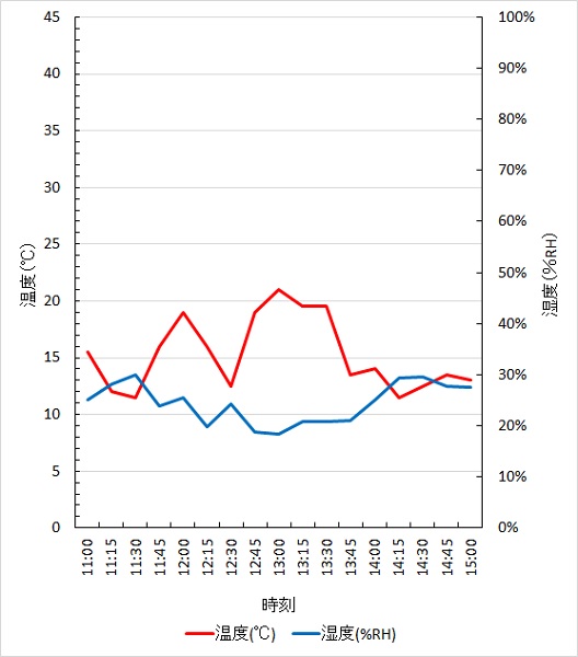 裏面の平均温度は15 ℃(最高: 21 ℃、最低: 12 ℃)、平均湿度は24 %RH(最高: 30 %RH、最低: 10 %RH)であった。
