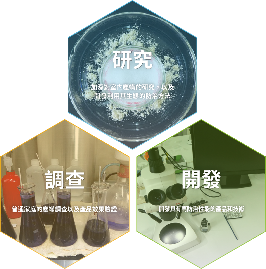 我們將以“科學研究塵蟎”為主題,不僅限於塵蟎的生態和活動,而是持續推進採用分子生物學的方法進行研究活動。本公司旨在加深對塵蟎的研究以及新產品的開發,為人們的健康生活做出貢獻。”